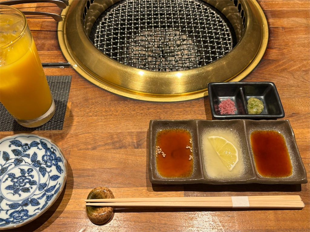 タレ、レモンだれ、だし醤油、ワイン塩、わさびがテーブルに並びます。